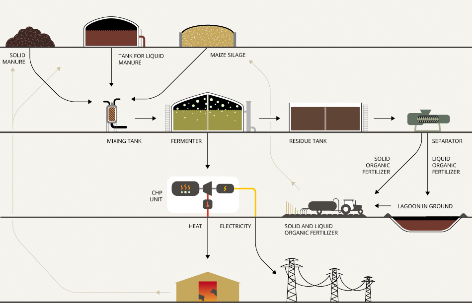 Anaerobic digestion is a common method for processing the waste from the livestock industry (liquid and solid manure), yielding electrical and heat energy and high-quality fertiliser.